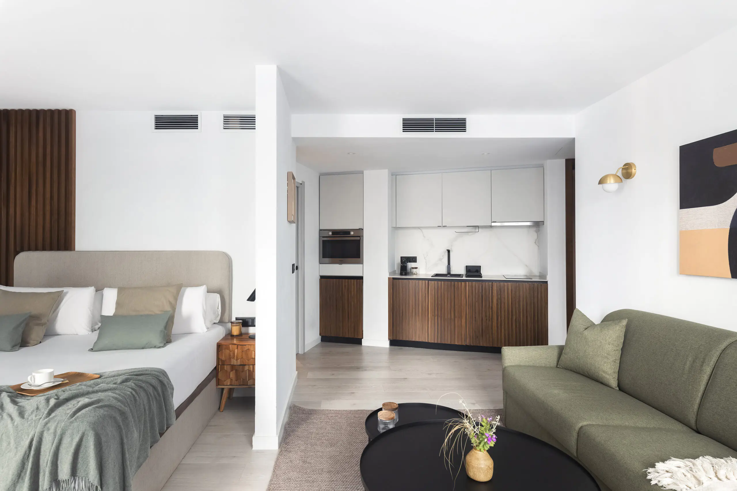 Gli interni riflettono un raffinato equilibrio tra il calore mediterraneo e le linee pulite dello stile scandinavo, creando un ambiente sereno ma accogliente nel cuore di Barcellona.