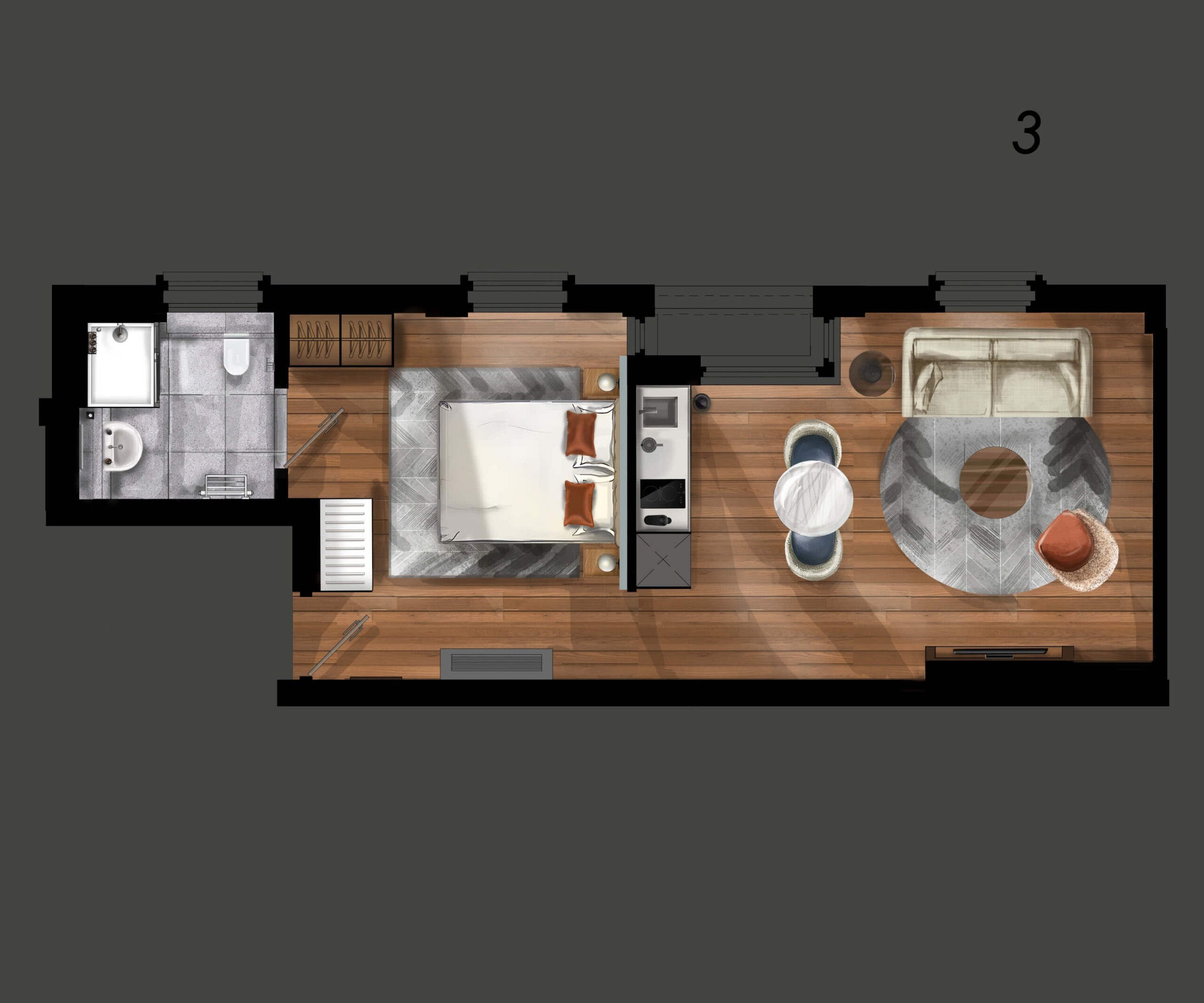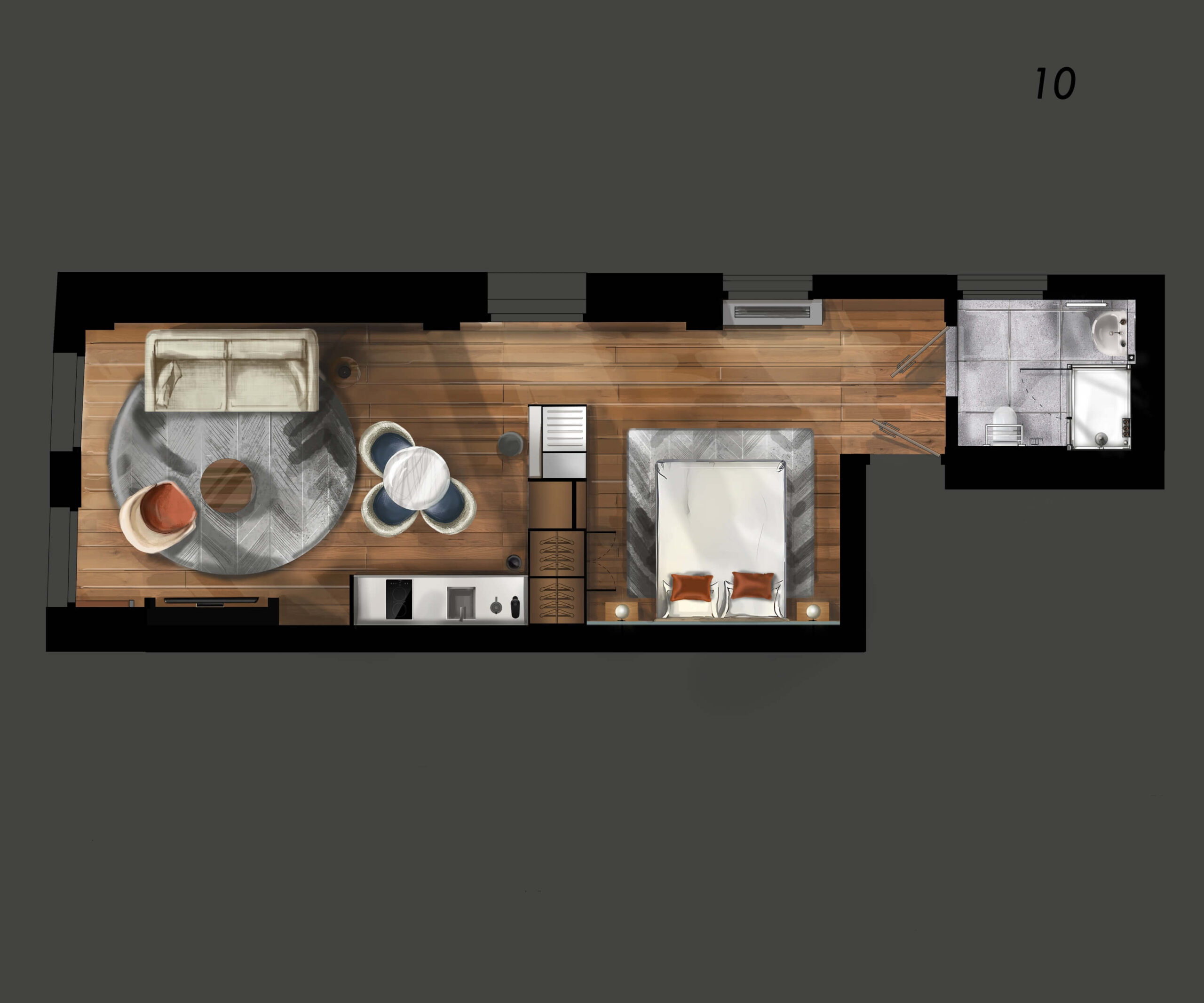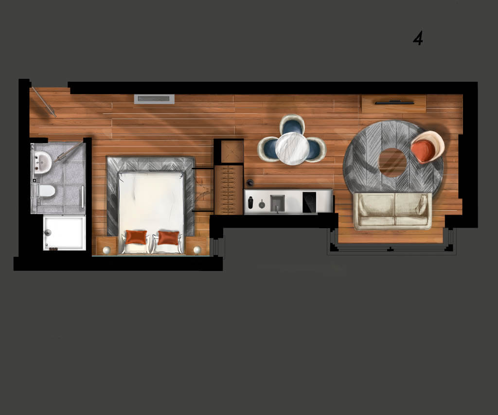 Questo appartamento di 39 mq è progettato per ospitare fino a 4 persone, offrendo un perfetto equilibrio tra stile e funzionalità. Il suo design moderno ispirato al mid-century presenta tonalità morbide e rilassanti di verde, blu, toni terrosi e legno naturale, creando un’atmosfera calda e accogliente.