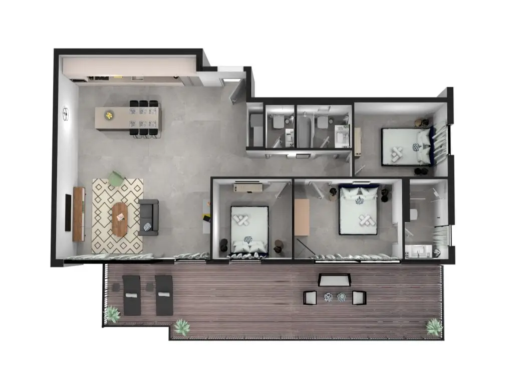 La cucina completamente attrezzata con elettrodomestici moderni dispone di tutti gli utensili necessari per preparare piatti deliziosi, che potrai gustare all’aperto o comodamente seduto sui 6 sgabelli dell’isola della cucina. La terrazza spaziosa invita a momenti di relax con lettini e sedie, perfetta per yoga o pasti all’aperto.
