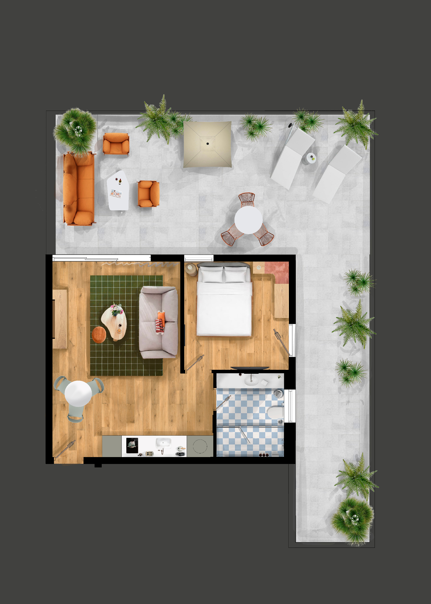Scopri il mix perfetto tra comfort e vita all’aperto nel nostro appartamento di 42 mq con terrazza spaziosa e divano letto, in grado di ospitare fino a 4 persone. La grande terrazza è perfetta per rilassarsi. All’interno troverai un soggiorno accogliente, una cucina completamente attrezzata, aria condizionata, TV a schermo piatto e Wi-Fi gratuito. Per garantire un soggiorno più confortevole l’appartamento è fornito di articoli da toeletta, macchina da caffè, lavatrice e asciugatrice.