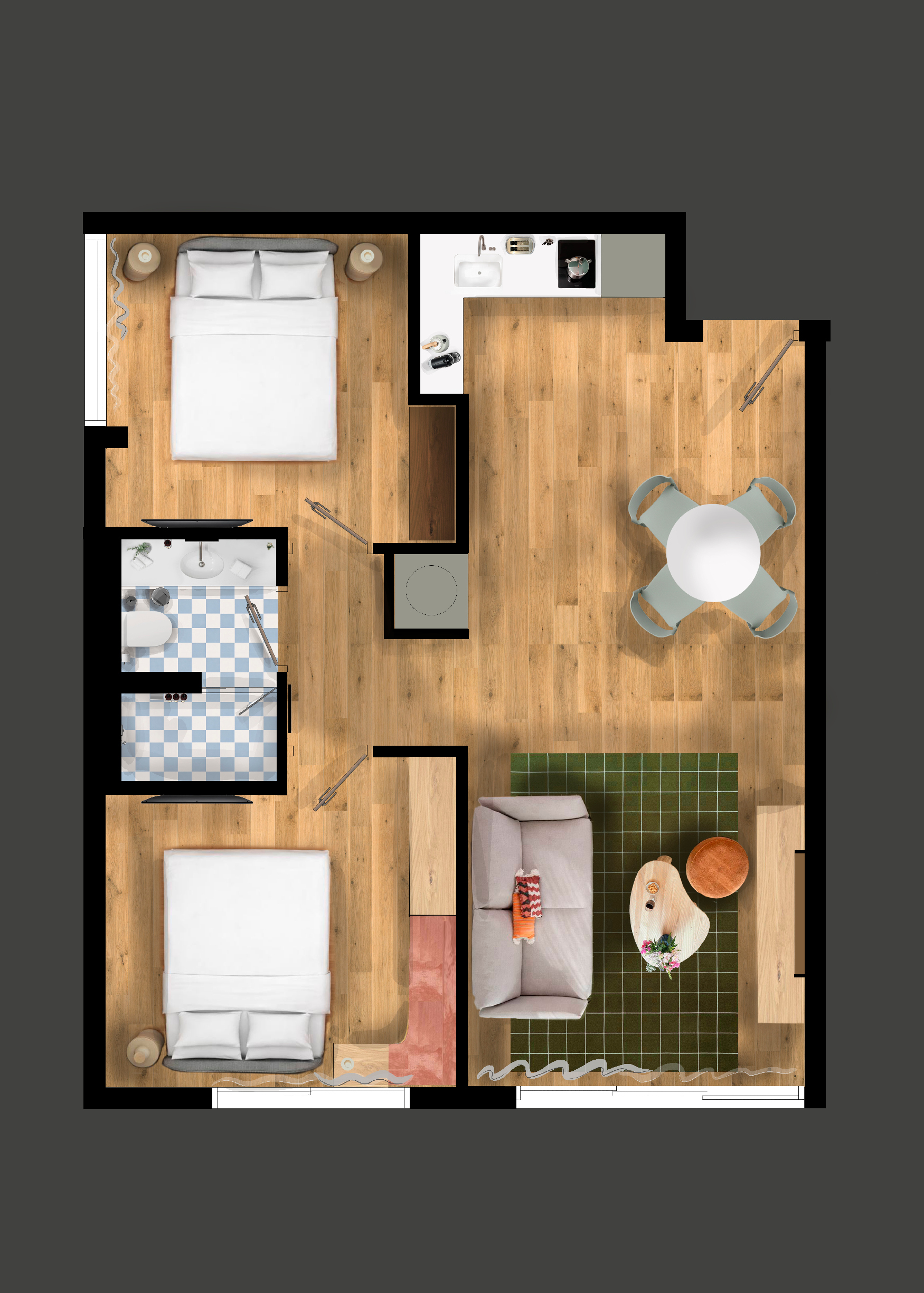 Il nostro appartamento con due camere da letto e divano letto di 60 metri quadrati, è ideale per ospitare fino a 6 persone. Progettato per il massimo comfort e relax, l’appartamento è dotato di aria condizionata, TV a schermo piatto, Wi-Fi gratuito e macchina per il caffè. Per un soggiorno senza pensieri, sono inclusi anche articoli da toeletta essenziali, lavatrice e asciugatrice, per garantirti la massima comodità.